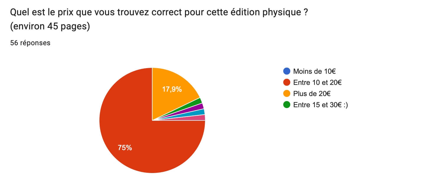 Au niveau du prix demandé, la fourchette préférée est entre 10 et 20€ ce qui nous semble correspondre effectivement à ce qui va être proposé. Il est probable cependant qu’on se rapproche plus des 20€ que des 10. Encore une fois, MimiRyudo et moi ne toucherons aucun bénéfice sur ces ventes, et si il y a un petit surplus, il sera utilisé pour les droits d’autrice de Justine.