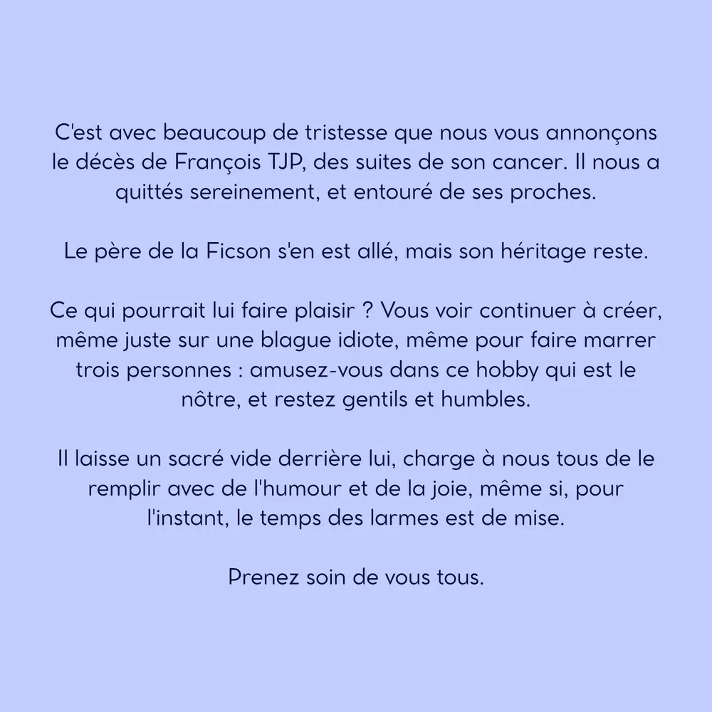 Sauf découverte de pépites d’or sur un disque dur perdu, il est peu probable qu’il y ait une sortie de ficsons inédites de François TJP qui seraient restées dans un placard à l’instar d’un nouvel EP de Johnny Hallyday…