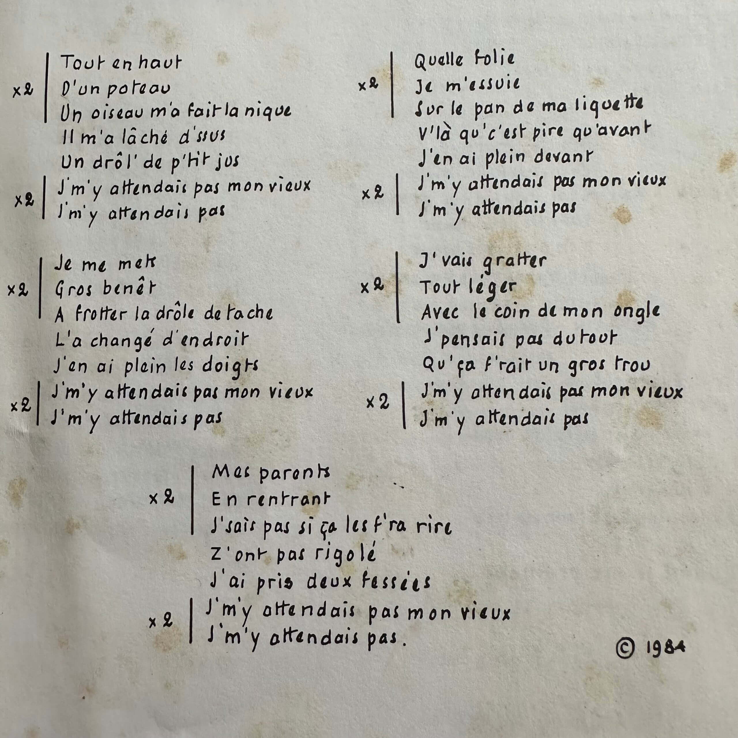 Pourtant ces mélodies qui restent en tête et ces paroles un peu idiotes m’ont beaucoup marqué et je suis sûr qu’en y réfléchissant, vous comprendrez d’où viennent certaines de mes créations musicales les plus intéressantes (Doubles petites toilettes, Lost my légumes…).